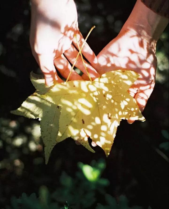 光線在樹蔭下形成漂亮的光斑,用其來當(dāng)作前景就能拍攝到創(chuàng)意的畫面,或者手捧一片落葉,也能美滋滋。