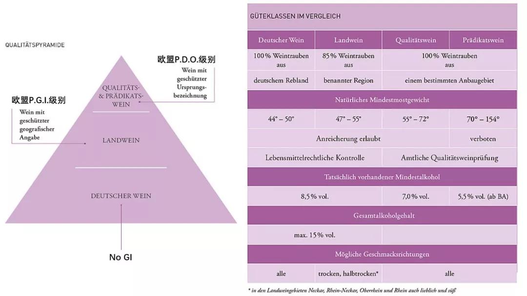 1971年,德國頒布了一套葡萄酒分級法規:葡萄采收時成熟度(最低含糖量,以予思勒度°Oe)越高,對應葡萄酒的等級就越高。