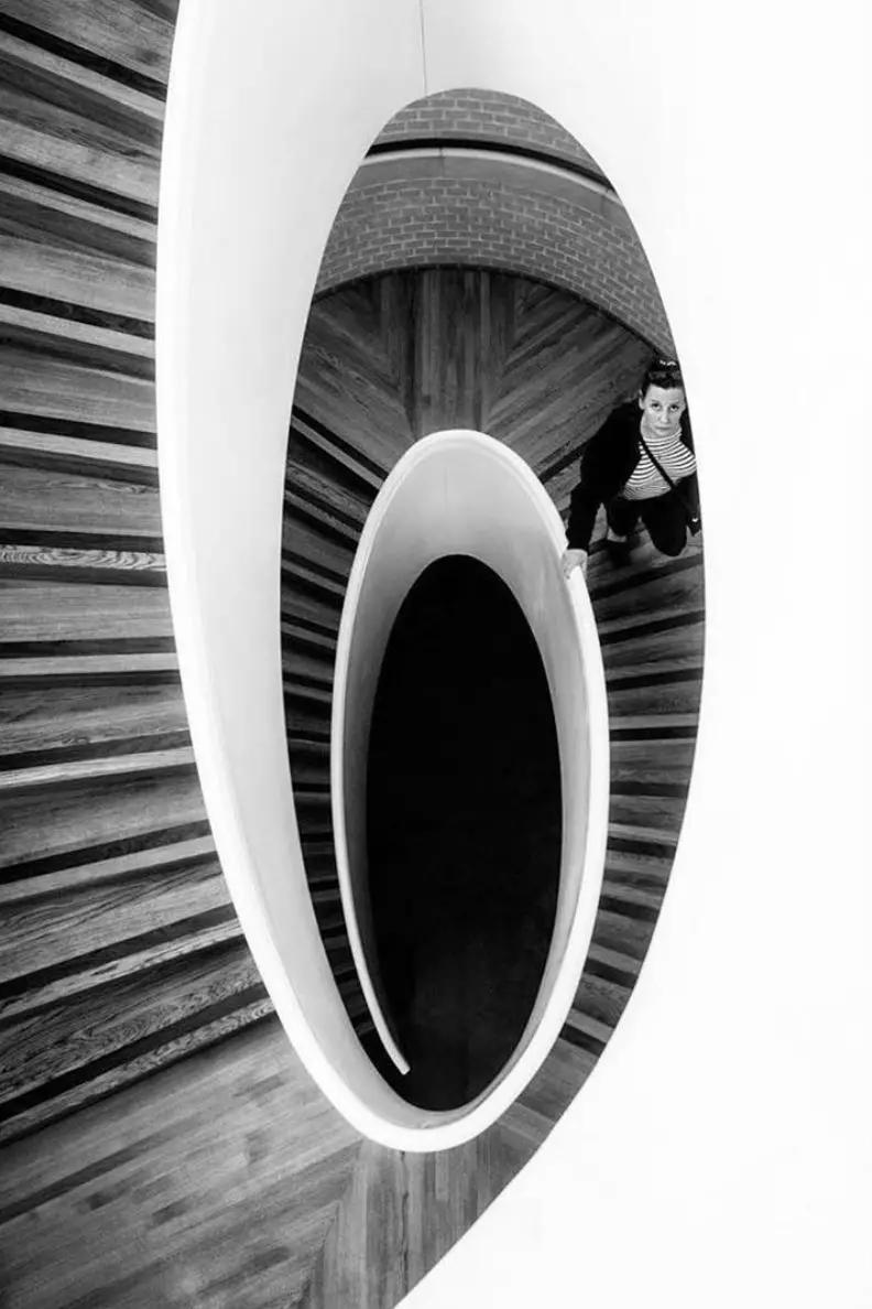 豐富的線條構成好看的幾何面。在拍攝時,可以多注意周圍墻壁樓層的顏色以及布局,把更多元素捕捉到鏡頭中來。當然最方便的還是這種框架式構圖。