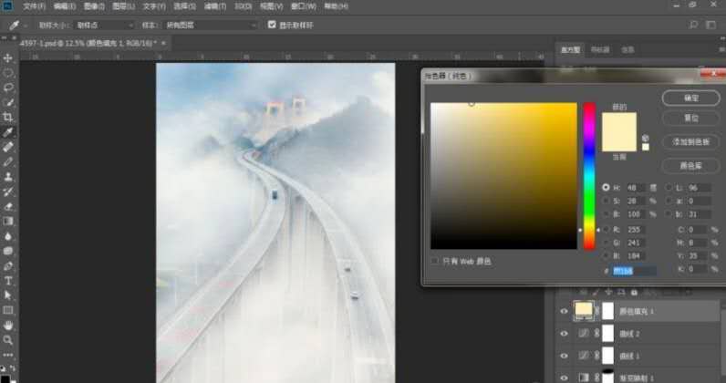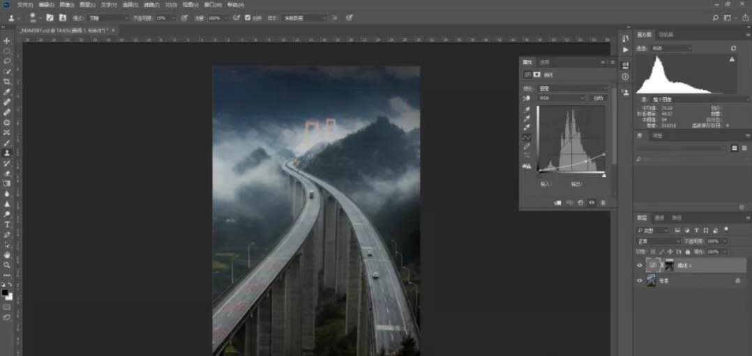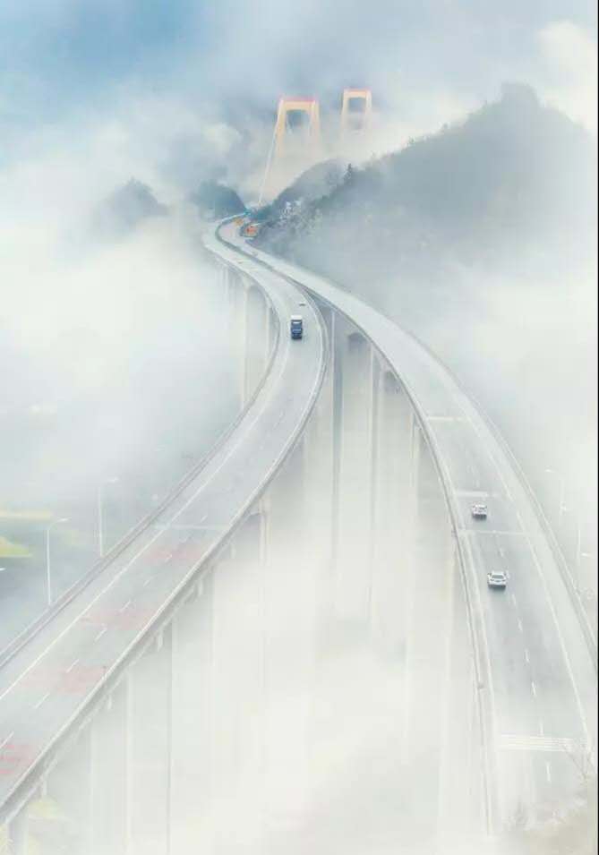 對原圖作適當的裁剪,使畫面更加簡潔。用矩形套索工具選取部分云霧,通過自由變換覆蓋整個畫面,選擇濾鏡-模糊-高斯模糊,對新圖層進行模糊處理,使云霧更自然,選擇圖層混合模式為濾色,并為該圖層建立蒙版,點擊“漸變工具”,選擇從前景色黑到背景色白的漸變,再選擇“徑向漸變”,前景色為黑色,用不透明度8%左右,編輯蒙板,擦出高架橋的部分,最后對該蒙版作適當的羽化。