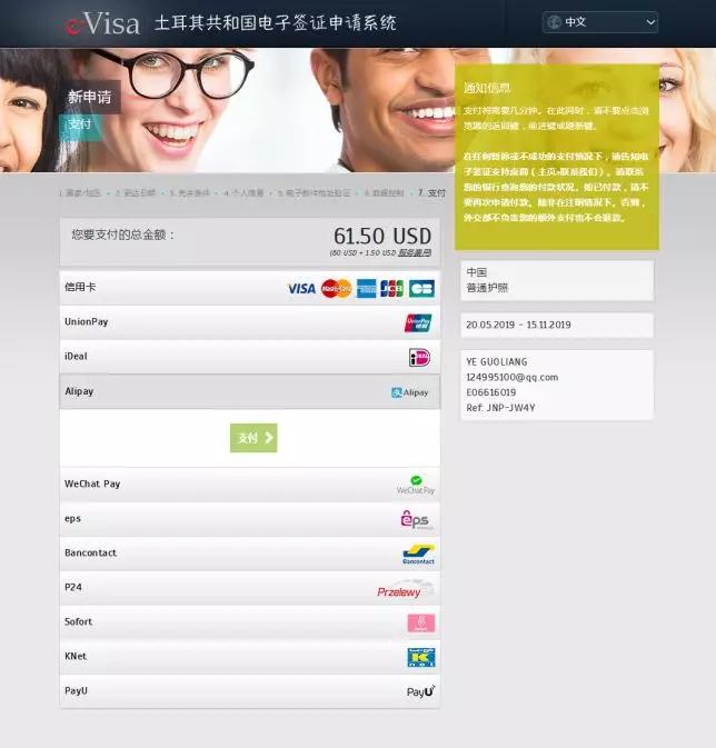 進入付款頁面,支付61.5美元的費用,其中60美元為簽證費,1.5美元為服務費。