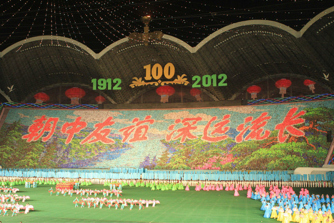 背景變換由朝鮮的小學生們手舉彩色翻板組成