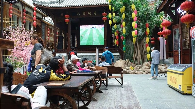 和很多仿古的景區一樣,在區域中心位置,都會有個戲臺。我們去的當天,戲臺的大屏幕上在播放世界杯的比賽,引來很多人流連。