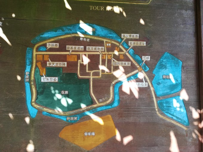 村口的全莊地圖,推薦停車(chē)在莊門(mén),莊門(mén)進(jìn)莊門(mén)出,幸存古屋集中在中心巷道東側(cè),南邊主要是花田。