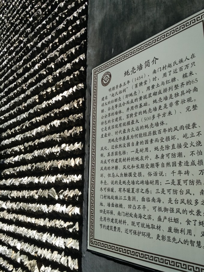 下面就是重頭戲:菉猗堂的蠔殼山墻,包攬我國(guó)最大、最古老、保存最好的蠔殼墻。蠔殼防潮通風(fēng)防臺(tái)風(fēng),屹立五百年而不倒,也是廢物利用的典范。