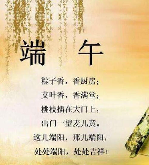 “棕子香,香廚房;艾葉香,香滿堂;桃枝插在大門上,出門一望麥兒黃;這兒端陽,那兒端陽,處處都端陽。”這首童謠所唱的便是中國的傳統節日"端午節”。
