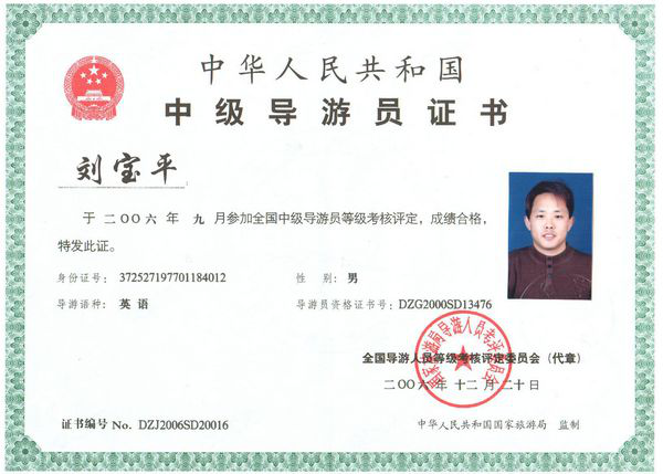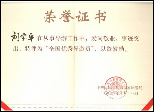 2006年公司董事長劉寶平獲得中華人民共和國國家旅游局授予的“全國優(yōu)秀導游員”稱號,并受到吳儀副總理的親切接見。全國優(yōu)秀導游員帶隊管理,相信我們能為您提供最優(yōu)秀的旅游服務;