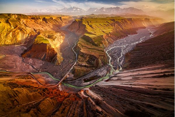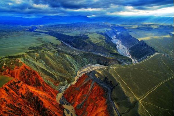 安集海河發(fā)源于天山山脈,通過長年沖刷,在通古特附近沖出天山峽谷,在天山北坡下形成了規(guī)模宏大的沖擊扇,河谷沖擊扇規(guī)模宏大,以傘形向北張開,甚稱地質(zhì)奇觀。此處非景點,本地人知道也不多,幾乎無游人,拍攝危險系數(shù)較大,站在山頂往谷底看,背脊發(fā)涼。