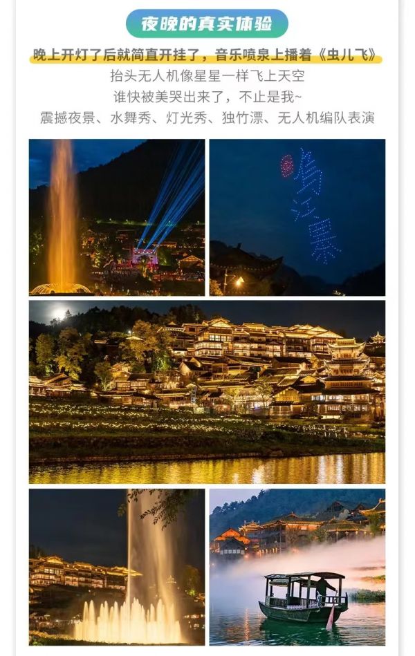4.保證入住網紅國際度假區——烏江寨,震撼夜景、水舞秀、燈光秀、獨竹漂和無人機編隊等表演。