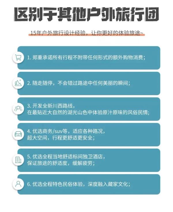 4、如途中遇不可抗因素(如高原反應、修路、塌方、車輛事故阻礙等)我方有權根據(jù)情況調整行程線路走向,此舉均是根據(jù)帶隊經(jīng)驗為大家更順利的游玩而做出的改變,希望大家理解和支持,但如造成額外費用由客人自理,望您諒解;若對行程造成影響的,我方將全力協(xié)助游客進行解決,但不承擔由此造成的損失,若因此而增加的費用,敬請游客自理。