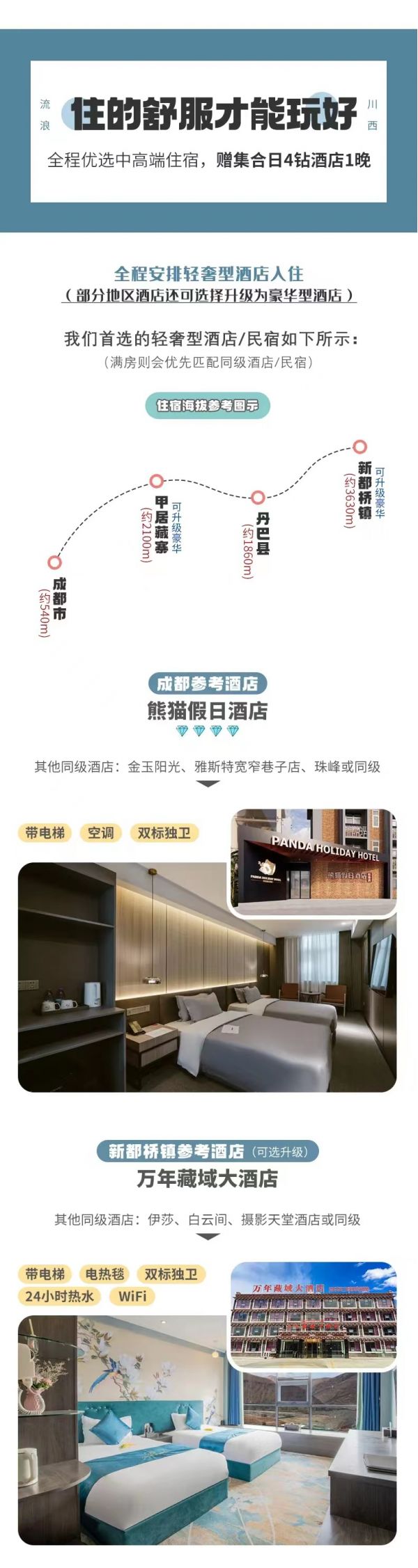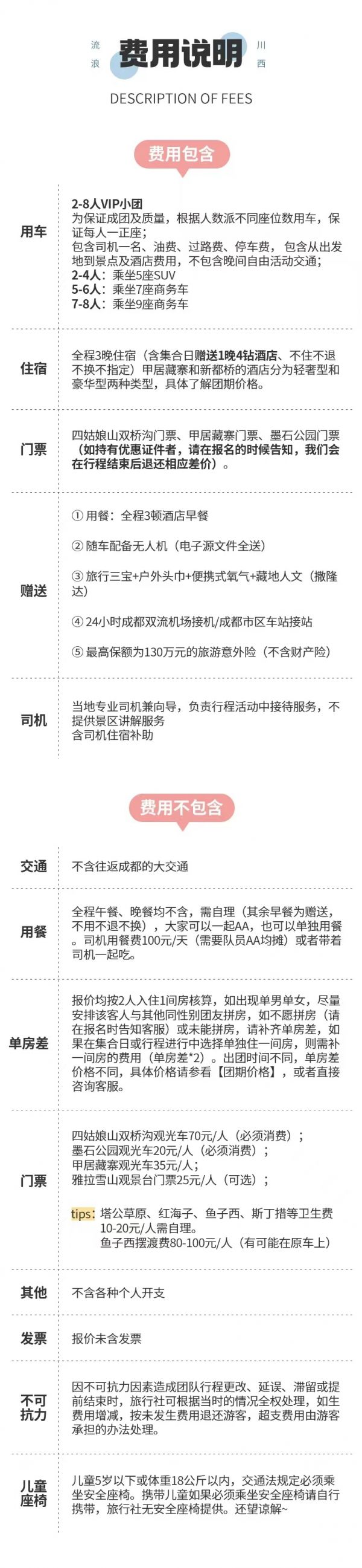 (3)因川西各景點間路途遙遠孕婦、哺乳期兒童、70歲以上老人不宜報團(65-70歲之間參團需簽訂免責協議)