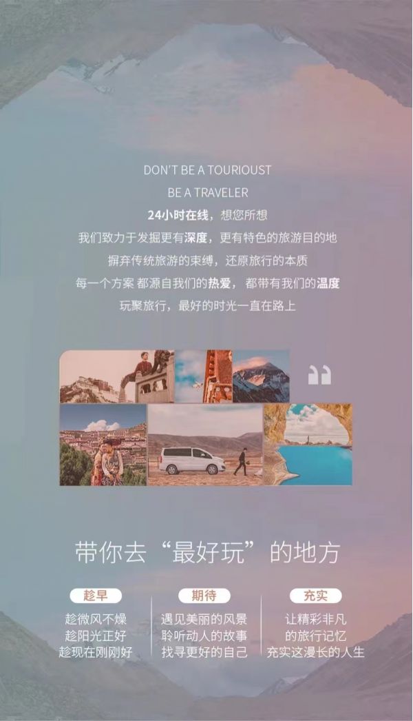 私人訂制:我們業務范圍囊括了全國各大城市,川西、西北、新疆、西藏,在路上永遠有我們的身影。我們將為每一個有定制需求的你策劃出獨屬于自己的完美旅行。