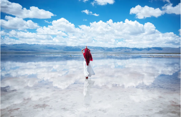 結(jié)晶之上是一層薄薄的鹵水,將天空、云朵和對(duì)岸的山都倒映在白色的湖里,非常漂亮,所以也被稱為“中國的天空之境”。可以乘坐景區(qū)內(nèi)的小火車前往景區(qū)深處游玩,如果不乘坐小火車,也可以沿著鐵軌向湖深處散散步拍拍照片也是非常愜意。