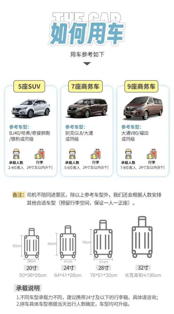 備注:車型承載力有限,攜帶行李為24寸或以下行李箱。