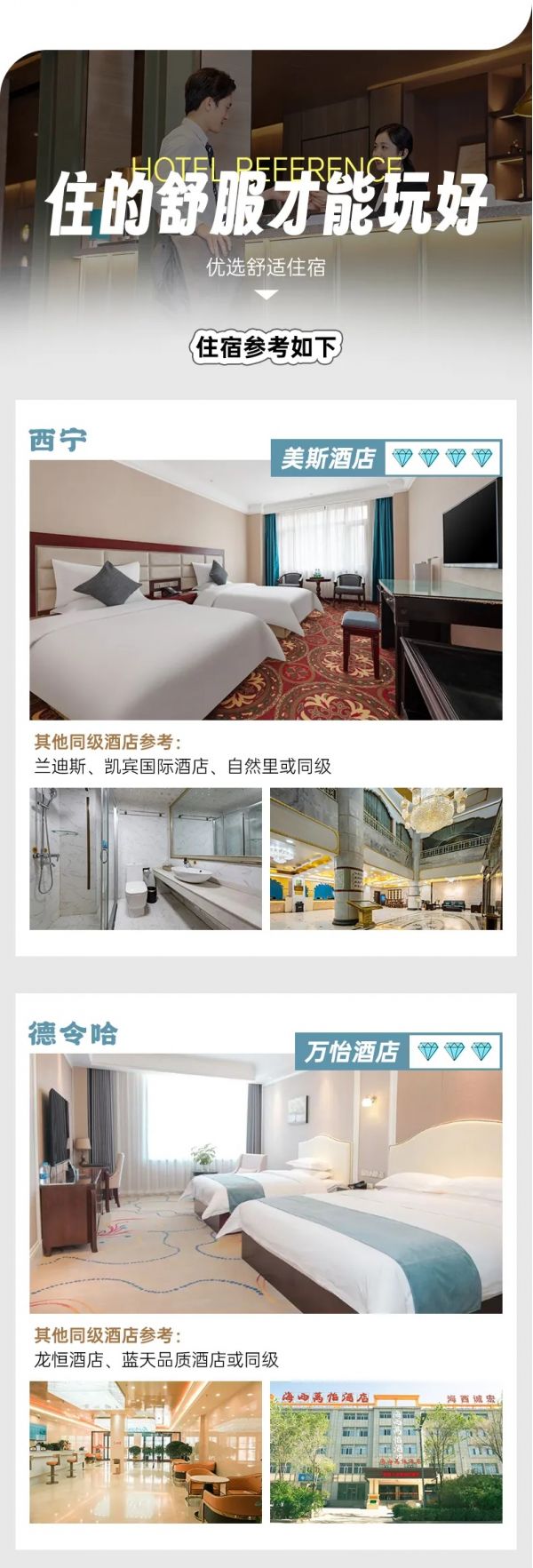 3.到達(dá)西寧后自行前往指定酒店入住,辦理入住時(shí)需要交押金,房費(fèi)已付,押金自理,報(bào)姓名拿房卡。