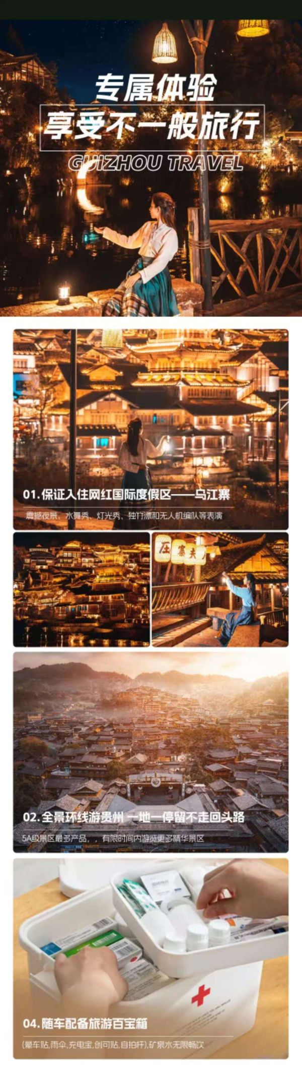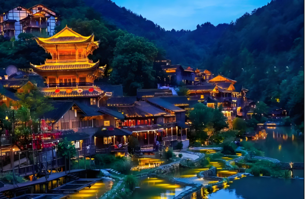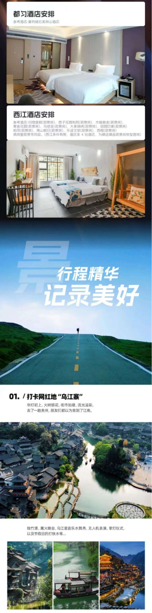 下午:午餐后乘車前往【烏江寨】國際旅游度假區(qū),車程約2.5H(景區(qū)電瓶車已包含,不限次數(shù)乘坐),江南千條水,云貴萬重山,一灣烏江碧水飄落在山間,如黛青山擁簇著烏江寨,兩岸吊腳樓錯落有致,滿滿的黔北風情,宛若治愈力拉滿的世外桃源,青山、綠水、吊腳樓、青磚黛瓦、民居、民俗、水舞秀...描繪出一幅黔北民居群落的壯美畫卷,在太乙閣碼頭坐上一艘搖櫓船,穿行在氤氳水汽之間,鱗次櫛比的吊腳樓撲面而來,斜倚船頭,坐看云煙升騰,晨光下的美景猶如一幅水墨畫在眼前暈染開來。景區(qū)是集觀光、休閑、度假、康養(yǎng)、會展為一體的大型綜合業(yè)態(tài)的旅游目的地。景區(qū)內(nèi)辦理入住酒店后自由游覽,晚上景區(qū)內(nèi)可以欣賞震撼壯觀的水舞秀、燈光秀、獨竹飄,無人機編隊表演等。