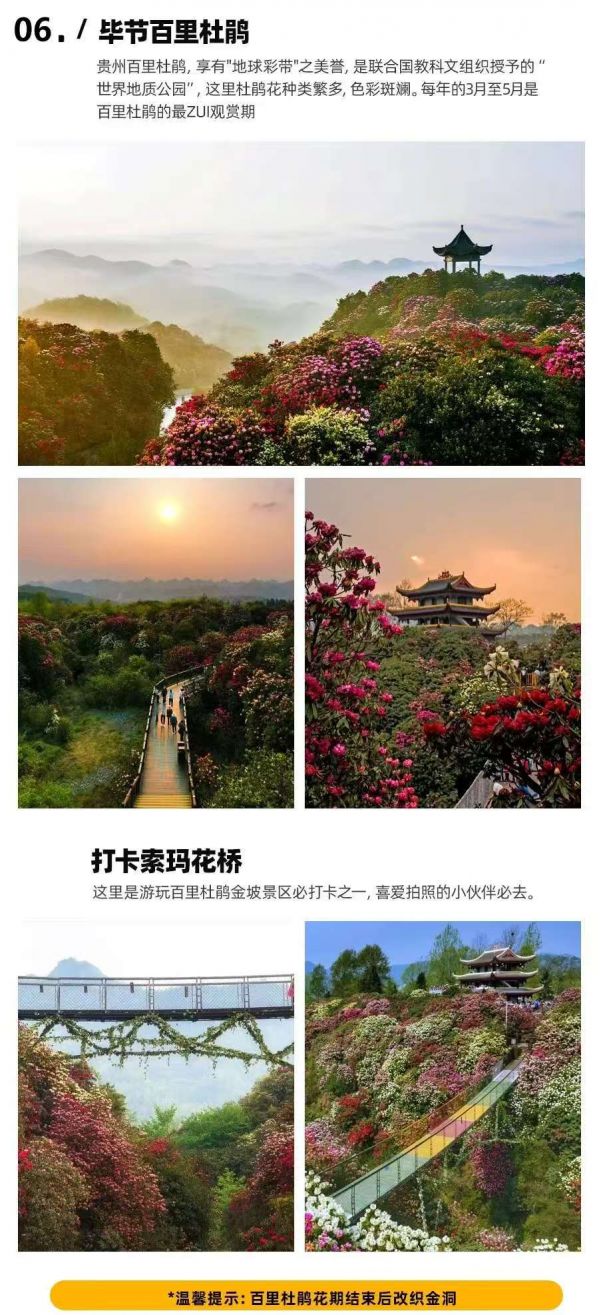 1、每年3-4月行程安排為百里杜鵑景區(qū),花期過后百里杜鵑景區(qū)替換成織金洞景區(qū),不同時安排游覽兩個景點。