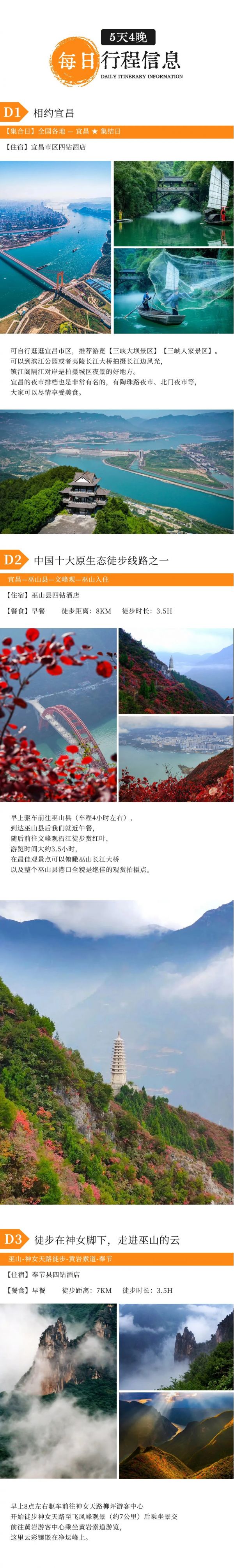 A:只要不是大暴雨,行程都是可以正常走的,請自備雨衣。秋雨蒙蒙的時候,巫峽上空的云霧翻騰,十分壯觀,我們徒步三峽畫廊從上往下俯瞰巫峽,就完全能理解詩人元稹寫下“除卻巫山不是云”這句詩的時候的心情了!