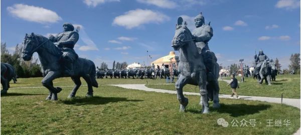 從蒙古包到成吉思汗陵,不過四分鐘車程。車剛停穩,仰頭便見“氣壯山河”石門劈開蒼穹,氣勢撼人。劉總摸著銅鑄的鐵馬金帳群雕感嘆:“你看這馬鬃,風從哪個方向來,它就朝哪個方向揚?!痹捯粑绰?,一陣風恰好掠過,雕像鎧甲上的浮塵簌簌掉落,恍惚間真有戰馬嘶鳴穿透時空,在耳畔回響。