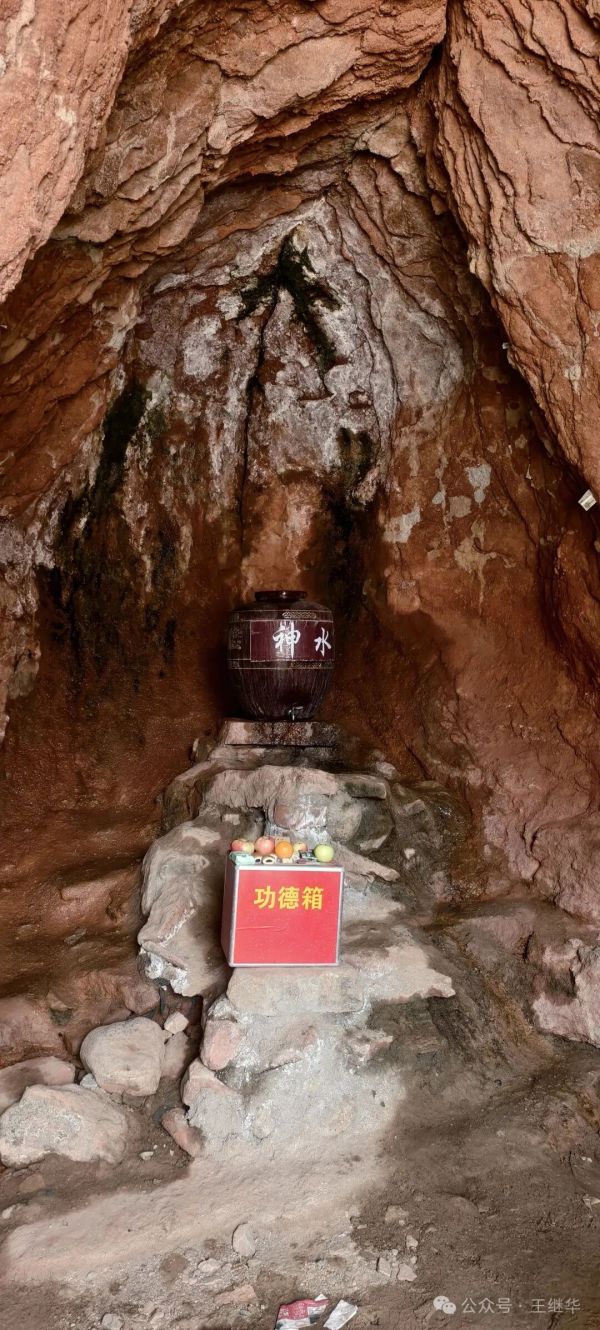 尋到神水洞時,因是陰天,光線稍暗,卻絲毫不影響清冽的泉水從巖縫滲出,滴落在下方石罈里,泛著細碎漣漪。掬一捧泉水入口,涼意順著喉嚨往下淌,瞬間驅散了徒步的微熱。