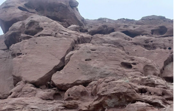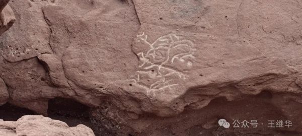 這些巖畫位于呼和溫都爾鎮西補隆嘎查炭窯溝口,周邊是白堊紀形成的紅色砂巖(因含氧化鐵呈紅色,硬度約四度)。