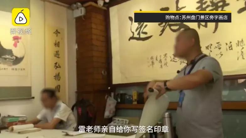 在購(gòu)物點(diǎn)蘇州盤門景區(qū)旁字畫店里,游客們又被忽悠買來(lái)歷不明大師的字畫。