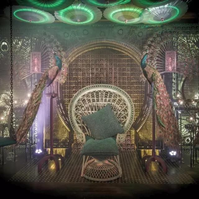 穿過一間鳥舍就來到奇幻的 Ophelia。以孔雀和鴉片館為靈感,奢靡,優雅,震撼都不足以形容這里的東方風情。中式的庭院,鐵鑄的玄關、孔雀羽毛制的壁燈和翠綠的天鵝絨沙發,設計師仿佛在用搭建電影場景的方式設計酒吧。