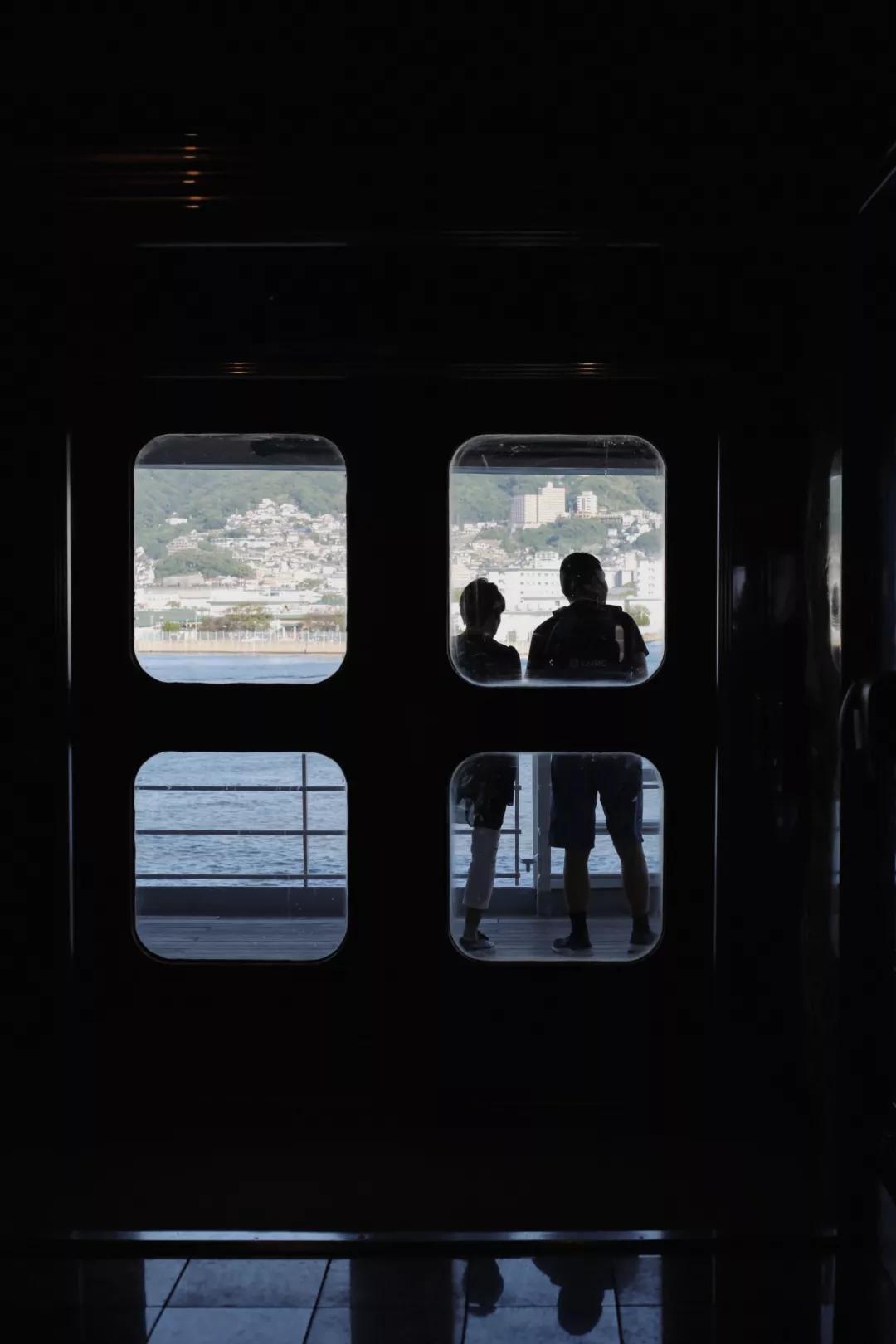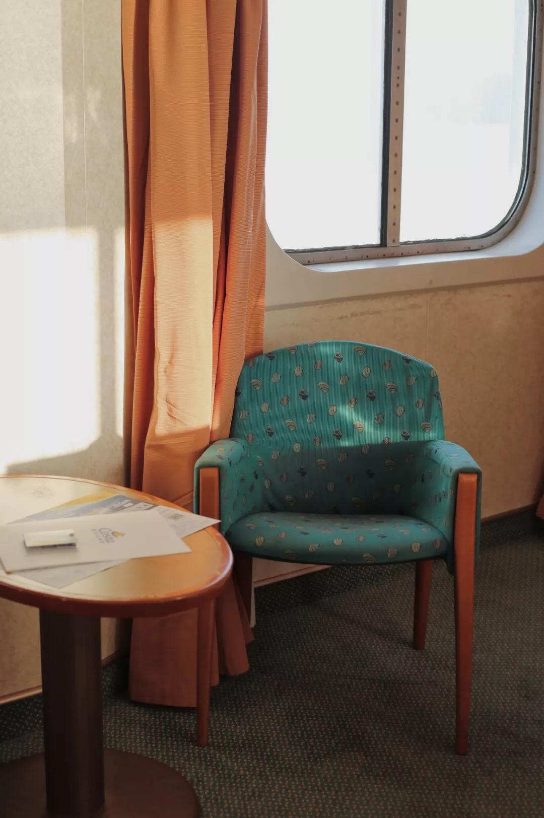 穿越漫長的走廊通道抵達房間,墨綠與橘黃的色彩搭配叫人心情明媚,從小巧的懸窗向外望,船只尚未起航,蒼茫的海水寧靜無波,而之后幾天,緩緩起伏的海浪會伴隨每一日黎明的惺忪睡眼與深沉的晚安。