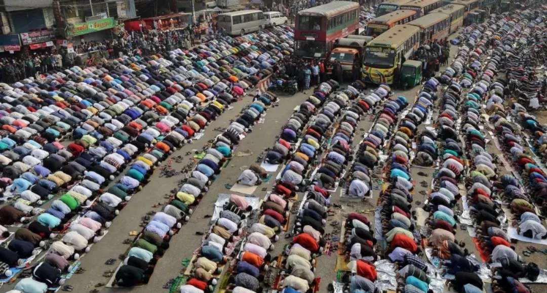 在伊教“全球盛會”期間,人們在孟加拉國的達卡街道上祈禱。“全球盛會”(Bishwa Ijtema) 是每年在達卡舉行的主要宗教聚會之一,聚集了數百萬信徒參加。專用的祈禱場地已經不足以容納這么多人,所以很多人來到達卡的主要街道祈禱。在此期間,所有地面交通和行人都將暫停等待儀式結束。
