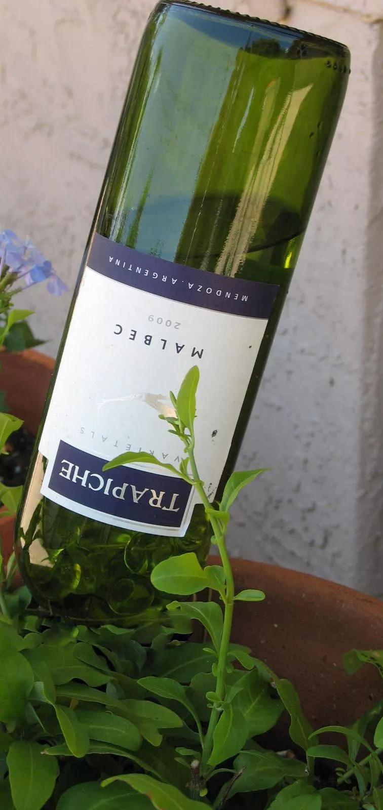 把酒瓶斜插入花盆中就可以形成一個(gè)灌溉裝置。