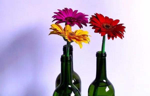 酒瓶特有的形狀好像天生就是為插花設(shè)計(jì)的。