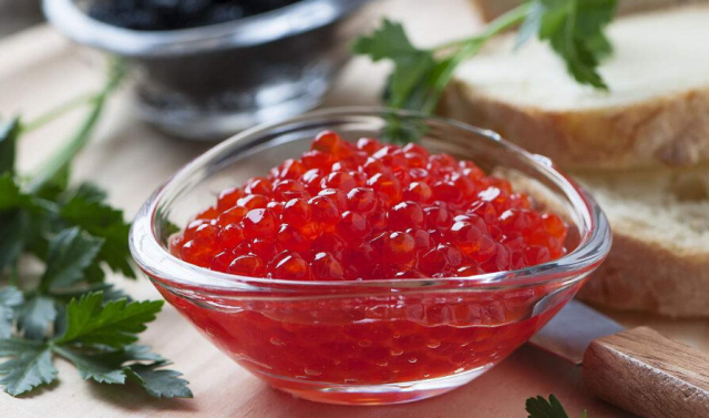 原料取自里海的鯨魚,嚴格說,只有用鯨魚卵制成的醬才能叫魚子醬。魚子醬是俄羅斯的頂級美食,其尊貴程度甚至要超越中餐里的鮑魚。魚子醬分為紅魚子醬和黑魚子醬兩種,黑色的產于鱘魚,紅色的產于鮭魚。