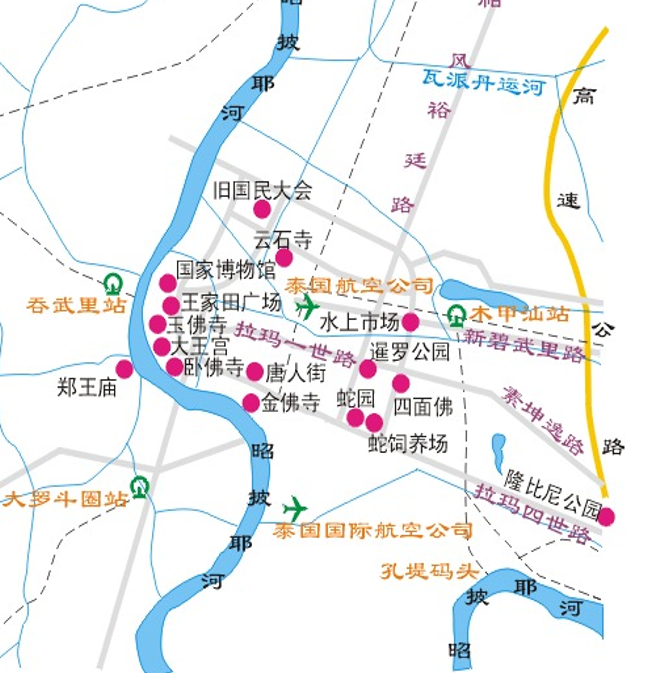 曼谷的市區(qū)主要景點(diǎn)如大皇宮、玉佛寺、臥佛寺、鄭王廟都在西部,即湄南河兩岸