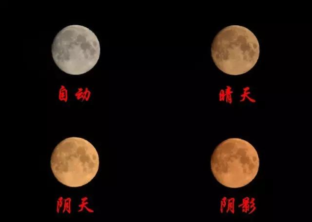 自動白平衡,月亮很白;晴天白平衡,月亮微黃;陰天白平衡,月亮很黃;陰影白平衡,月亮不僅黃,而且發紅。