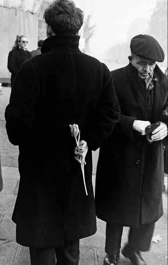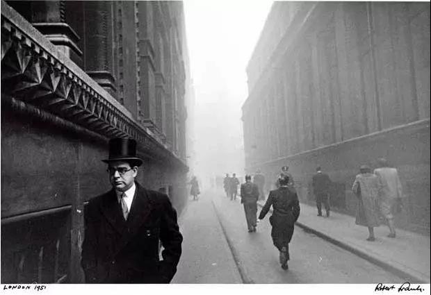 返回紐約后, 1949~1953 年期間,弗蘭克又多次前往歐洲各國,先是拍攝花都巴黎,制作了一本以鮮花為主題的影集,送給他的未婚妻;后來拍攝了英國倫敦濃霧中銀行家頭戴圓頂禮帽、身著大衣、手持雨傘或手杖來去匆匆的典型英國人形象,以及滿臉漆黑的威爾士礦工辛苦勞動的照片;在西班牙他捕捉到一頭背插匕首的牛面對斗牛士的精彩畫面。他在每座城市都尋找最有代表性的意象,通過片斷的、稍縱即逝和內省的個人化影像,并將它們作為一個整體,共同表達他對該城市的感受。