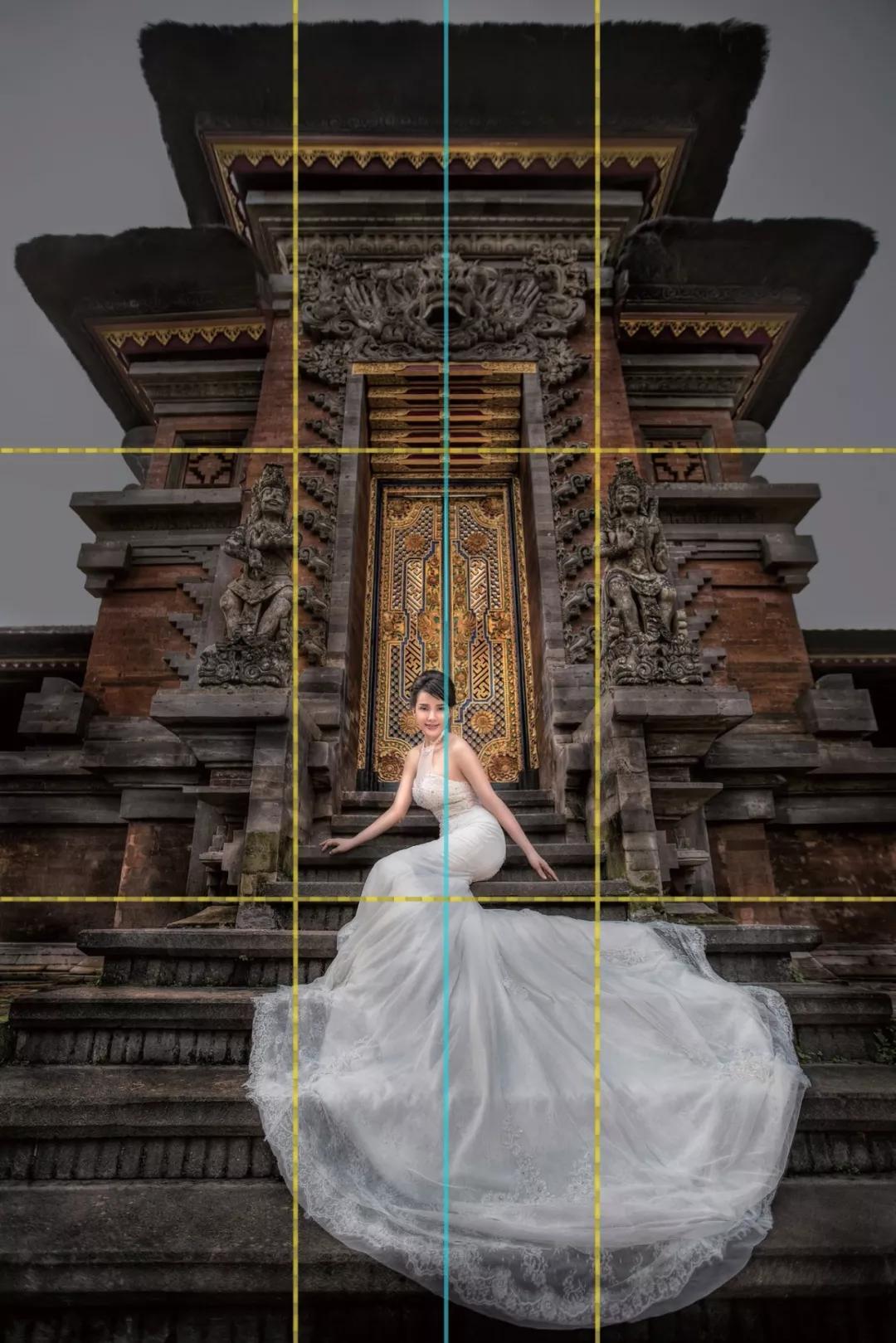 但其實(shí)這也是借用了建筑物的線條引導(dǎo),將觀者注意力從前景延伸到背景,又或者從背景過(guò)渡到畫(huà)面主體(藍(lán)色線為對(duì)稱參考線)。
