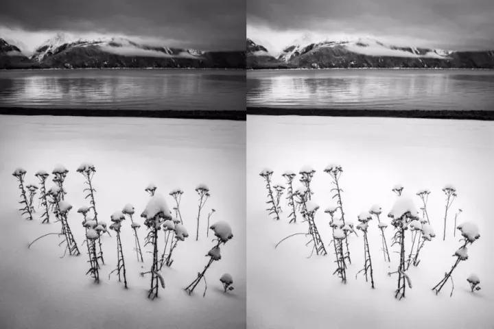 而如果你使用后期軟件,就可以做到只調(diào)整畫面某個部分的白平衡。用Lightroom 的例調(diào)整筆刷工具,或 Photoshop 的圖層蒙版,都可以做到只改變山峰的色溫: