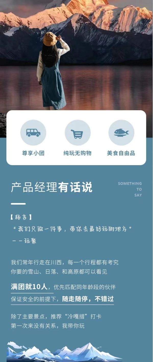 私人訂制:我們業務范圍囊括了全國各大城市,川西、西北、新疆、西藏,在路上永遠有我們的身影。我們將為每一個有定制需求的你策劃出獨屬于自己的完美旅行。