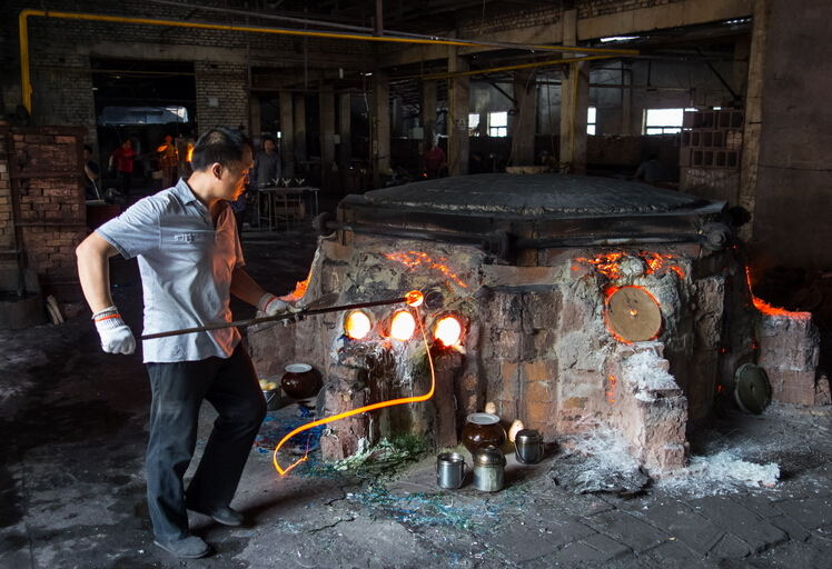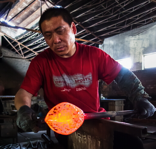 全程拍攝大爐琉璃制作,博山是琉璃之鄉,保留傳承了琉璃加工的傳統技藝,并在此基礎上又自己的開拓創新。琉璃的制作工藝相當復雜,火里來、水里去,要幾十道工序才能完成,古法琉璃的精品制作,相當費時,有的光制作過程就要十幾二十天,而且主要依靠手工制作。八卦爐,爐里的溫度在1400-1600度,工作車間內的溫度能達到50攝氏度左右。還有傳說琉璃是一個叫路申的博山人在用八卦爐煉丹的時候偶然發現的,觀其在經過烈火煅燒之后還可以晶瑩剔透,遂以長生不老之丹為名進獻給當時的國君,并置于朝堂以消滅災禍。所以佩戴琉璃小飾品還有去災避禍的用處。大師提取原料吹制的過程,都是大師們用空心的管根據顏色的需要從爐口中提取,然后用空心管吹制。在吹制的過程中,溫度就會下降,然后再上回溫爐進行加工。