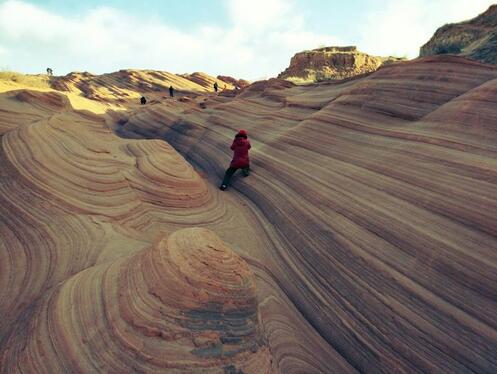 波浪谷是一種紅砂巖地貌,因巖砂上的紋路像波浪,被叫做"TheWave",即波浪。上世紀(jì)80年代,人們?cè)诿绹?guó)亞利桑那州和猶他州交界處發(fā)現(xiàn)了波浪谷,神奇的外觀和極高的科研價(jià)值使其成為了世界八大巖石奇觀之一。而靖邊的波浪谷也有著與美國(guó)波浪谷媲美的紅砂巖峽谷。中國(guó)靖邊波浪谷和美國(guó)波浪谷的差距并不大,都是紅砂巖地貌,靖邊波浪谷更加年輕,只有6000萬(wàn)年,很多砂土還沒(méi)來(lái)得及凝固為巖石,地處黃土高原與毛烏素沙漠交匯地帶的靖邊縣龍州鄉(xiāng)。