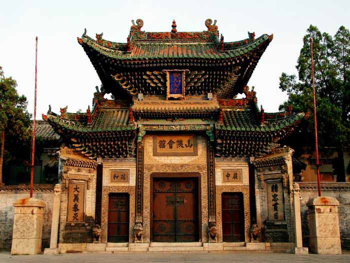 山門,是會館的大門,三間牌坊式門樓,上方懸掛的豎匾“協天大帝”,是說關公是協助上天統御萬眾的神。下方的木質浮雕垂花門罩,雕刻著白象、版權所有聊城聊之旅旅行社有限公司,轉載必究!駱駝、麒麟等佛教吉獸和托塔天王李靖等佛教天王。大門高3米,寬2.3米,兩側的對聯是歌頌關公的,“本是豪杰作為,只此心無愧圣賢,洵足配東國夫子;何必仙佛功德,唯其氣充塞天地,早已成西方至人。”意思是說:關公的所作所為己經是一位豪杰了,而他的思想和品德就算和圣賢相比,也是無愧的,足可以和東方魯國的孔夫子相媲美;您何必修仙拜佛呢,關公并沒有那樣做,但他的浩然正氣卻能夠充塞于天地之間,早已成為最完美的人了。對聯將關羽的地位放在頂點,以和孔子相匹配,體現出濃郁的地方特色。兩邊的小門上方各有石刻匾額一方,體現出儒家思想的中庸之道:“履中”是說做人應該行為中正;“蹈和”是講接人待物應該和氣,在這里也可以體現出商人講究和氣生財的處世哲學。