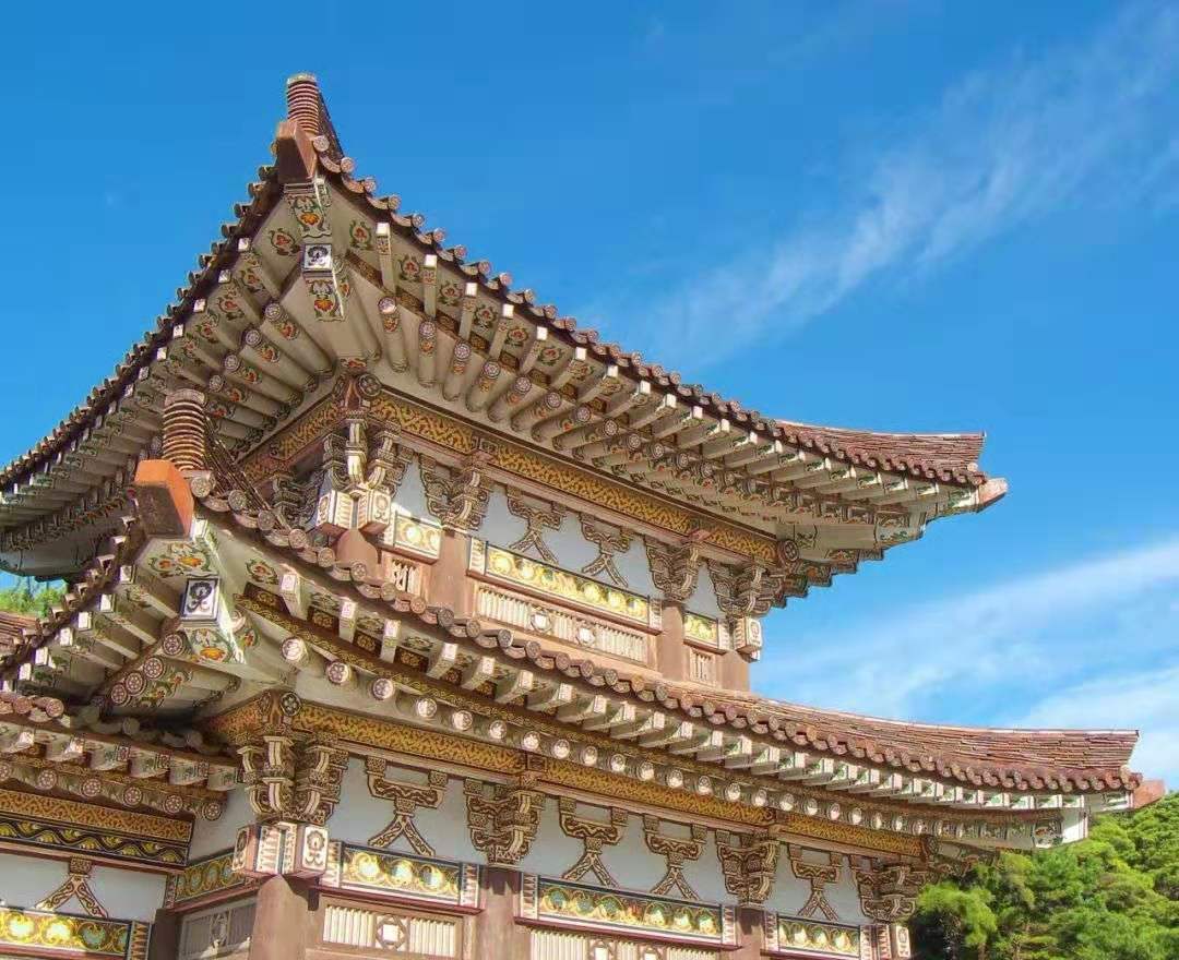 大雄殿是普賢寺最華麗最大的建筑,位于寺院正中央,建筑結(jié)構(gòu)如同中國的寺廟。黑色的魚鱗瓦,朱紅色的圓木柱子,金色的門欞,大殿正門面額上的牌枋黑底金字寫著漢字“大雄殿”。