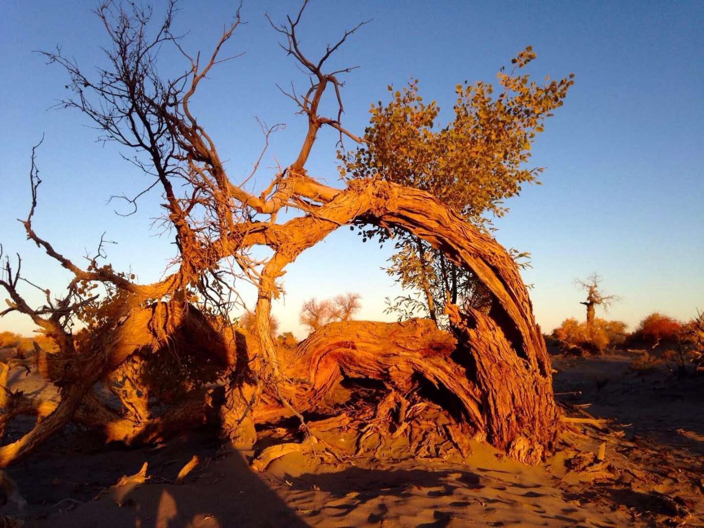 漫步在濃郁的胡楊林中,仿佛進入神話般的仙境。茂密的胡楊千奇百怪,神態萬般,或挺拔、或似蒼龍騰越,令人驚喜不已,嘆為觀止。每到深秋,樹葉金黃,矗立在沙海中的胡楊更顯嬌美動人,風光無限。