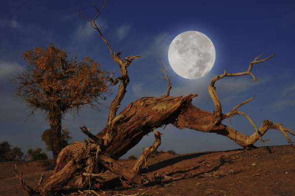 水而枯死。胡楊特有的耐腐特性,使大片枯死的胡楊樹干依然直立在戈壁荒漠之上,形成形態怪異的悲涼景觀。