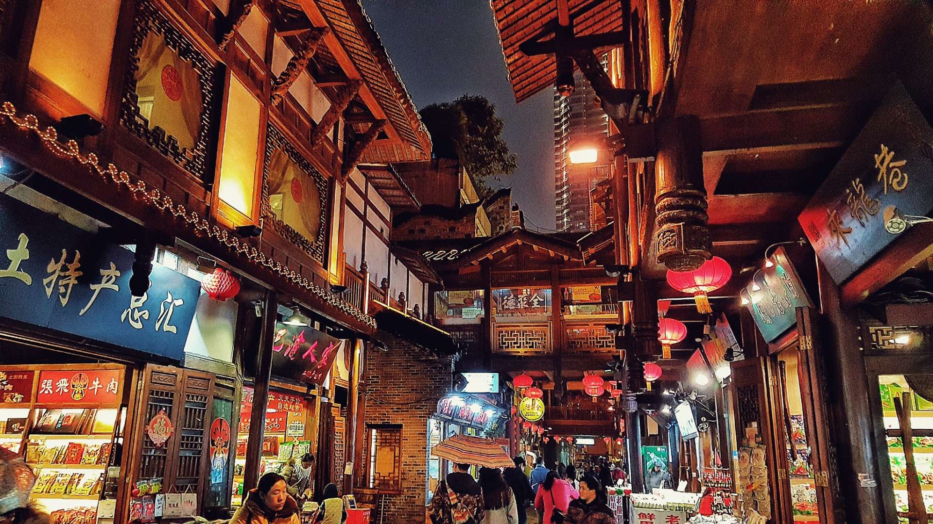 展現的是“另類美食城”的景色,位于第4層,集中了中外名店。臨江一面有工匠當街打糍粑、切桃片、烤制花生糖,以及現場演繹美食特產制作工藝,臨崖一面有小吃店,旦旦面、豬兒粑、大湯圓、歌樂山辣子雞、黔江雞雜,老重慶毛血旺等。