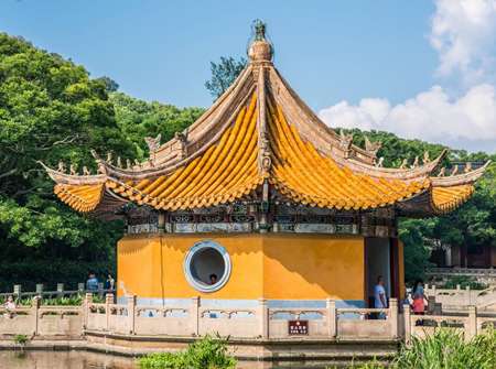 蓮花池三面環山,四周古樟參天,每年六月蓮花盛開,池中樹影、亭影、橋影倒映,構成一幅美妙的圖畫。夏夜入靜,荷香沁人,池中銀花伴月影,形成普陀山十景之一——“蓮池夜月”,令人流連忘返。普濟寺占地37019平方米,共有10殿、12樓、7堂、7軒,計23l間,建筑面積11400平方米。全寺有六進殿堂,自南向北貫串在一條中軸線上。