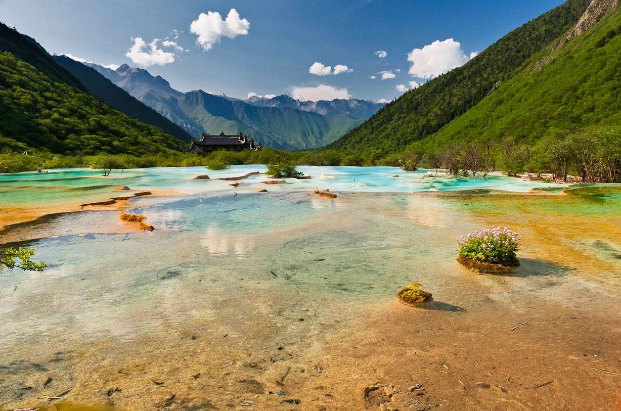 進入黃龍景區,首先看到的是一組精巧別致、水質明麗的池群--迎賓池。池子大小不一,形狀奇特,色彩艷麗,錯落有致,四周山岳環峙,林木蔥蘢,山間野花競放,彩蝶飛舞。山間石徑曲折盤旋,點綴著觀景亭閣,倍添情趣。