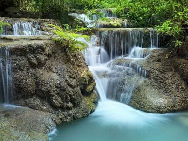 告別迎賓池,沿著曲折的棧道蜿蜒而上,可見到千層碧水沖破密林,順坡而下,在高約10米、寬約60余米的巖坎上飛瀉而來,形成數十道梯形瀑布,如珍珠流滾落,銀光閃爍;如水簾高掛,云霧蒸騰;如絲般緩流,舒展飄逸;如珠簾閃動,風姿綽約。瀑布后有一座陡崖,多為馬肺狀和片狀鈣化覺積,凝垂欲滴,色澤金黃,使整個瀑布顯得富麗壯觀。經太陽余輝點染,反射出不同的色彩,遠望如彩霞從天而降,分外輝煌奪目,號稱“飛瀑流輝”。