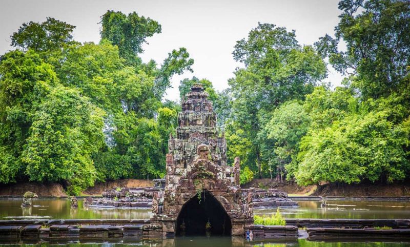 涅盤宮建于12世紀,是佛教廟宇,大水池中央有個小島,島上只有一座仿造「須彌山」而建造的石塔小寺廟,石塔上雕刻兩只纏繞的巨蛇王(Naga),小島東側(cè)還有一座白馬雕像,而Neak Pean的意思是「纏繞的巨蛇」,就是取自島上的巨蛇王像而得名。