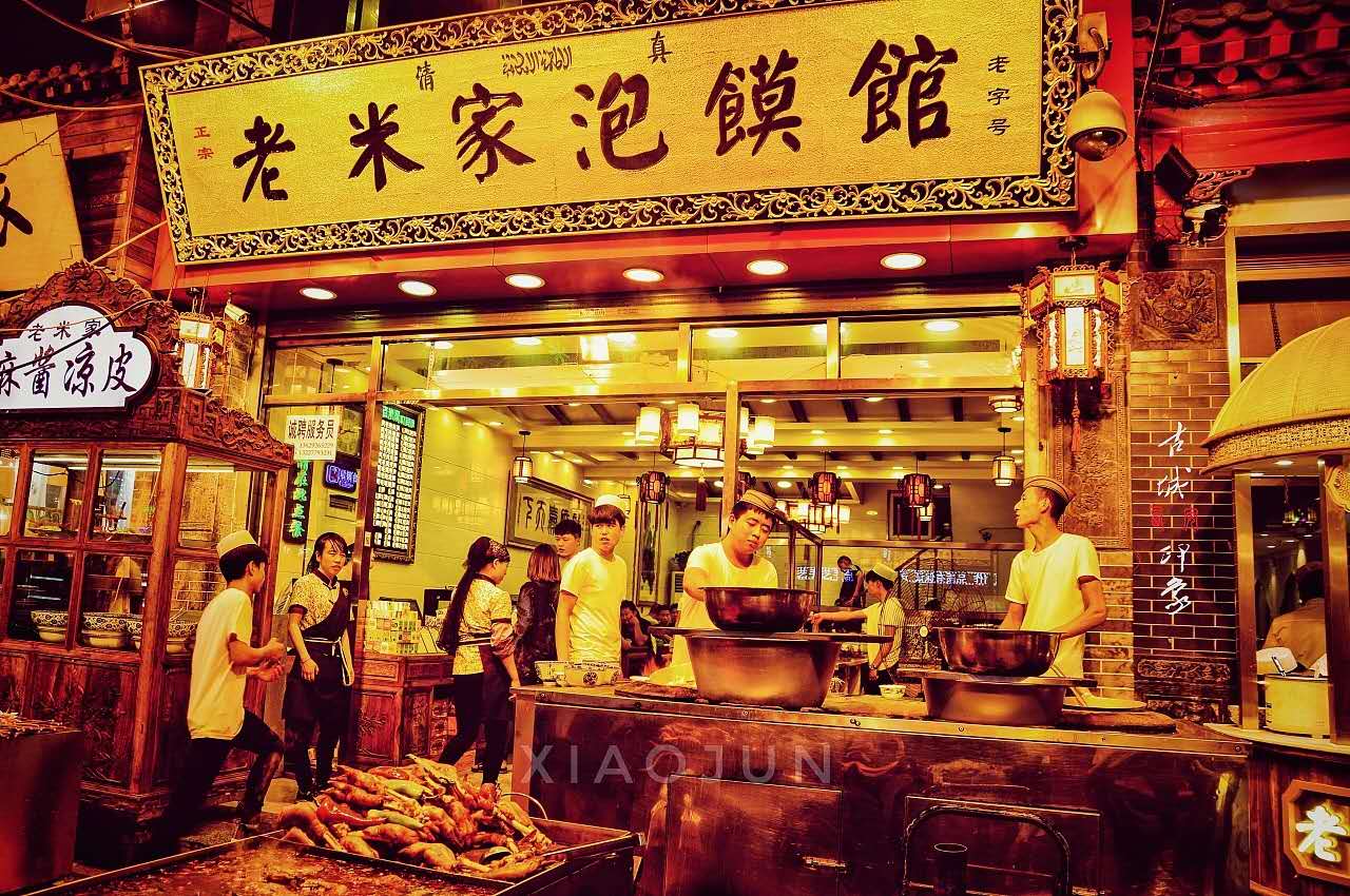 晚上的回民街有著與白天不同的精彩,整條街被濃厚的市井氣息籠罩,道路兩旁遍布掛著電燈、汽燈的各種攤鋪,主要販賣糕餅、干果、蜜餞、小吃。這些小攤后面則是許多經營當地風味小吃的飯館,人多時不光店里人